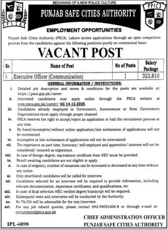 Punjab Safe Cities Authority Jobs 2025 announce the Contract career opportunities for the post of See Below Ad in Punjab, Lahore for the fresh and experienced candidates on Contract basis who have Check Advertisement degree. Posted date of this post is 30/11/2025 and the last date is 14/12/2025. if you are eligible for this job apply before due date.