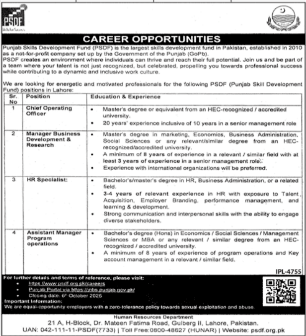 Punjab Skills Development Fund PSDF Lahore Jobs 2025 announce the Contract career opportunities for the post of See Below Ad in Punjab, Lahore for the fresh and experienced candidates on Contract basis who have Check Advertisement degree. Posted date of this post is 24/09/2025 and the last date is 06/10/2025. if you are eligible for this job apply before due date.