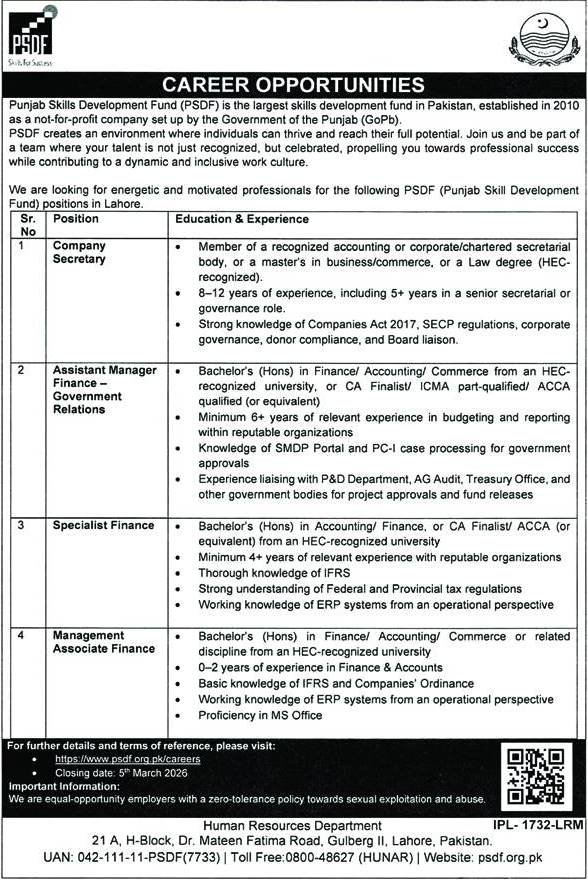 Punjab Skills Development Fund PSDF Lahore Jobs 2026 announce the Contract career opportunities for the post of See Below Ad in Punjab, Lahore for the fresh and experienced candidates on Contract basis who have Check Advertisement degree. Posted date of this post is 18/02/2026 and the last date is 05/03/2026. if you are eligible for this job apply before due date.