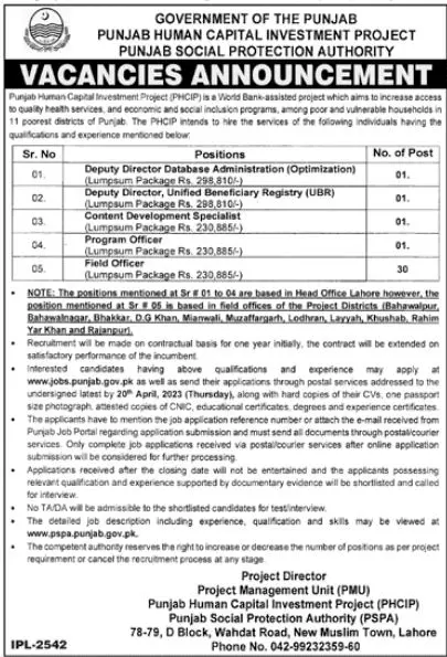 Punjab Social Protection Authority Jobs 2023 announce the Contract career opportunities for the post of See Below Ad in Punjab, Lahore for the fresh and experienced candidates on Contract basis who have Check Advertisement degree. Posted date of this post is 04/04/2023 and the last date is 20/04/2023. if you are eligible for this job apply before due date.