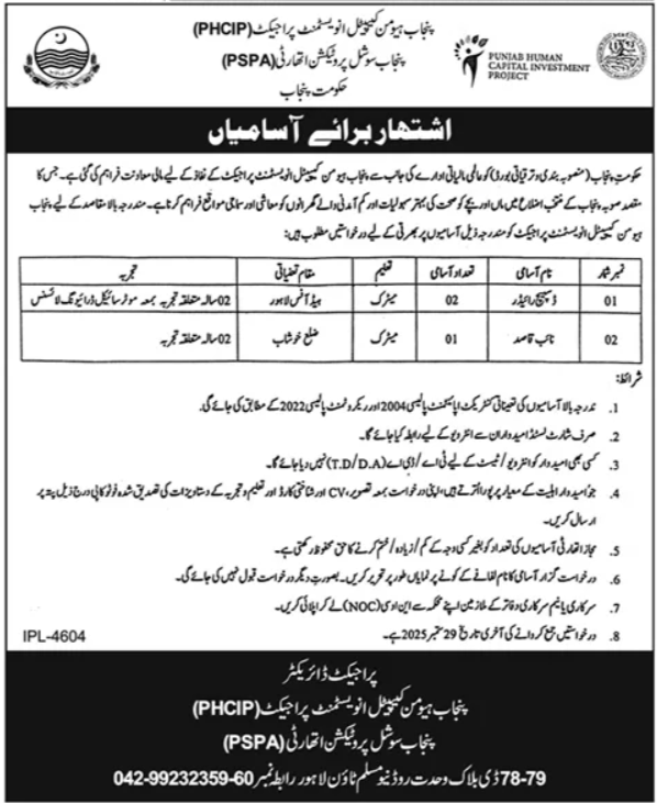 Punjab Social Security Protection Authority PSPA Lahore Jobs announce the Contract career opportunities for the post of See Below Ad in Punjab, Lahore for the fresh and experienced candidates on Contract basis who have Check Advertisement degree. Posted date of this post is 17/09/2025 and the last date is 29/09/2025. if you are eligible for this job apply before due date.