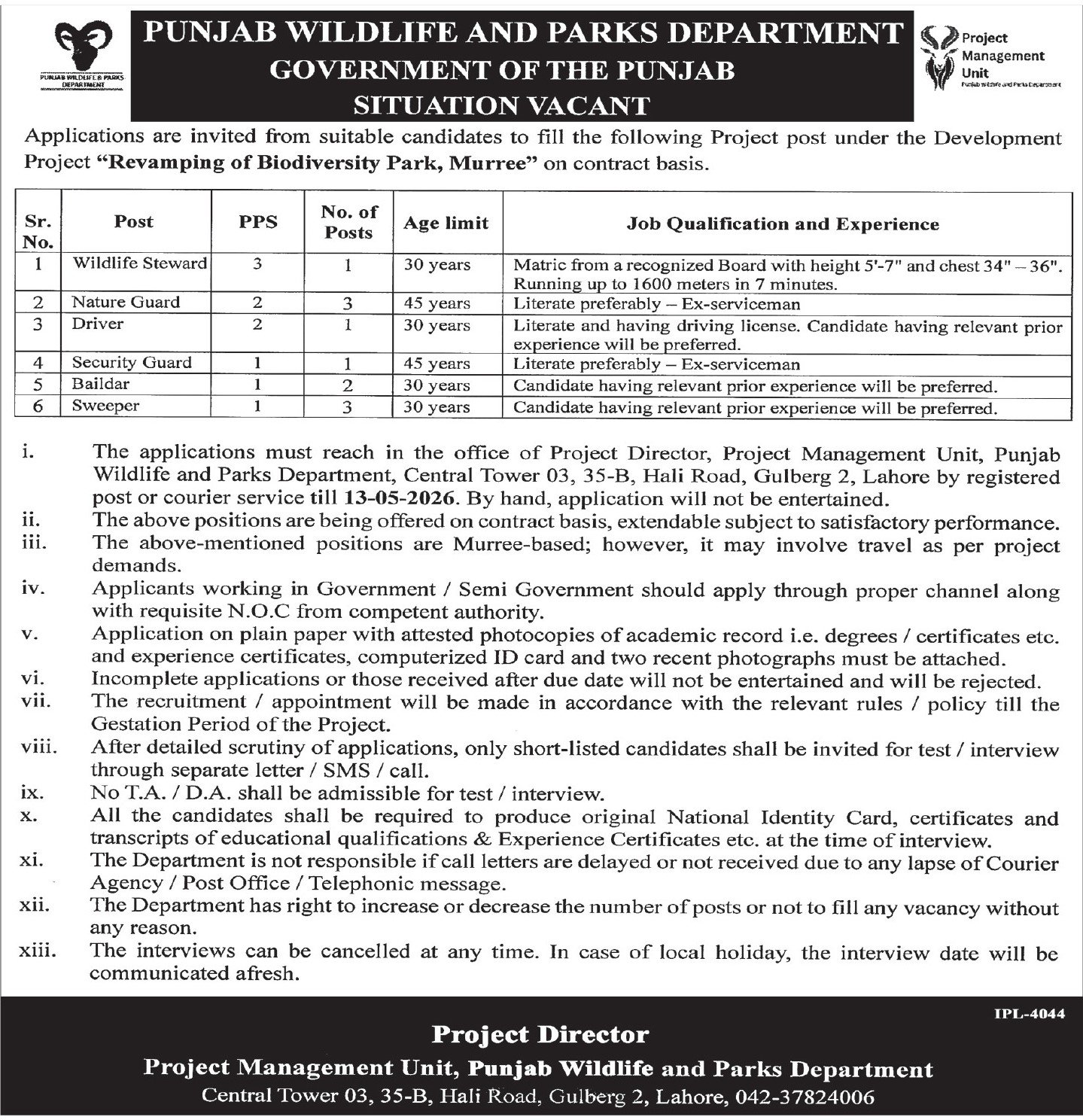 Punjab Wildlife & Parks Department Lahore Jobs 2026 announce the Contract career opportunities for the post of See Below Ad in Punjab, Lahore for the fresh and experienced candidates on Contract basis who have Check Advertisement degree. Posted date of this post is 25/04/2026 and the last date is 13/05/2026. if you are eligible for this job apply before due date.