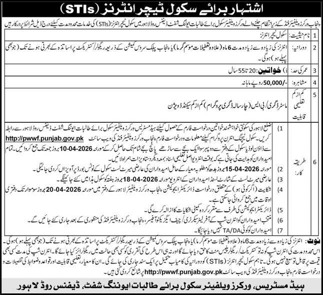 Punjab Worker Welfare Fund School Teacher Jobs 2026Interns Punjab Worker Welfare Fund School Teacher Jobs 2026Interns
