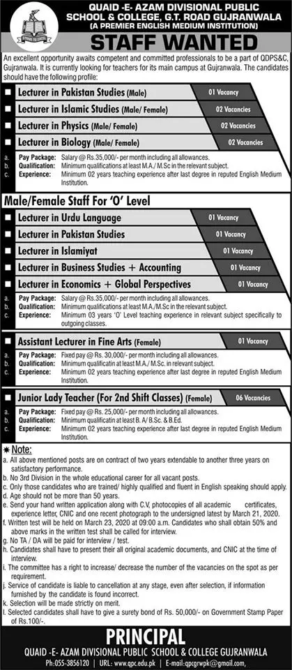 Quaid E Azam Divisional Public School & College Jobs 2026