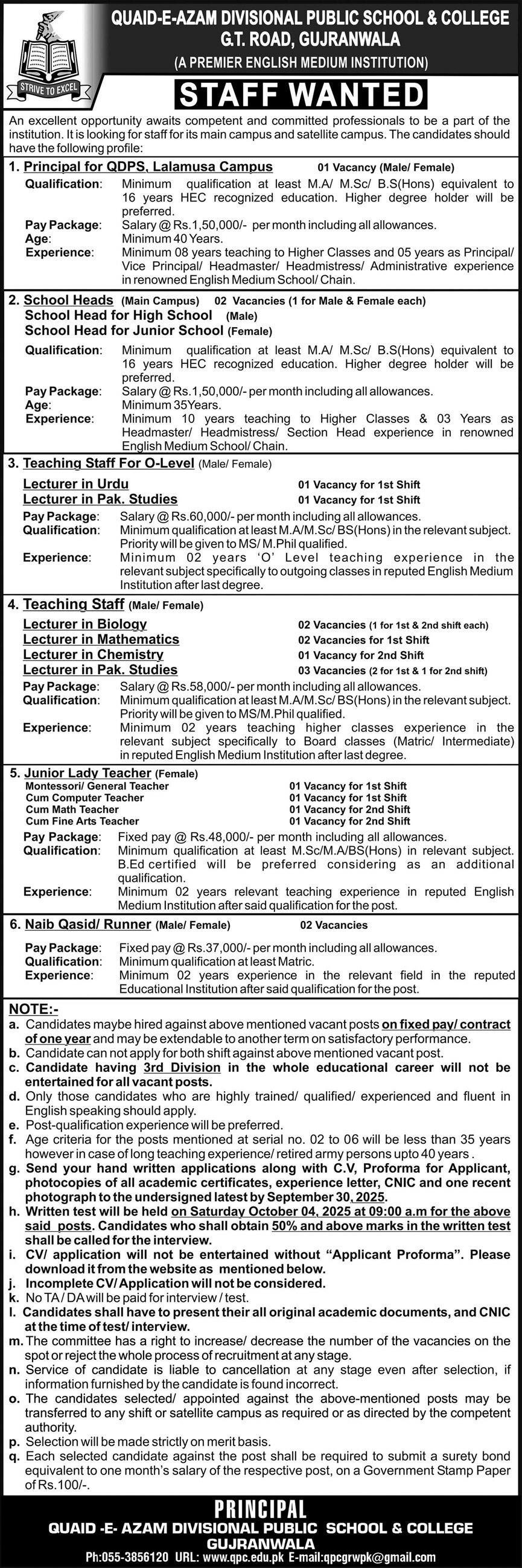 Quaid E Azam Divisional Public School Jobs 2025 announce the Contract career opportunities for the post of See Below Ad in Punjab, Gujranwala for the fresh and experienced candidates on Contract basis who have Check Advertisement degree. Posted date of this post is 21/09/2025 and the last date is 30/09/2025. if you are eligible for this job apply before due date.