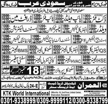 Quality Control Engineer & Fire Fighting Technician Jobs announce the Contract career opportunities for the post of See Below Ad in Saudi Arabia for the fresh and experienced candidates on Contract basis who have Check Advertisement degree. Posted date of this post is 17/09/2025 and the last date is 18/09/2025. if you are eligible for this job apply before due date.