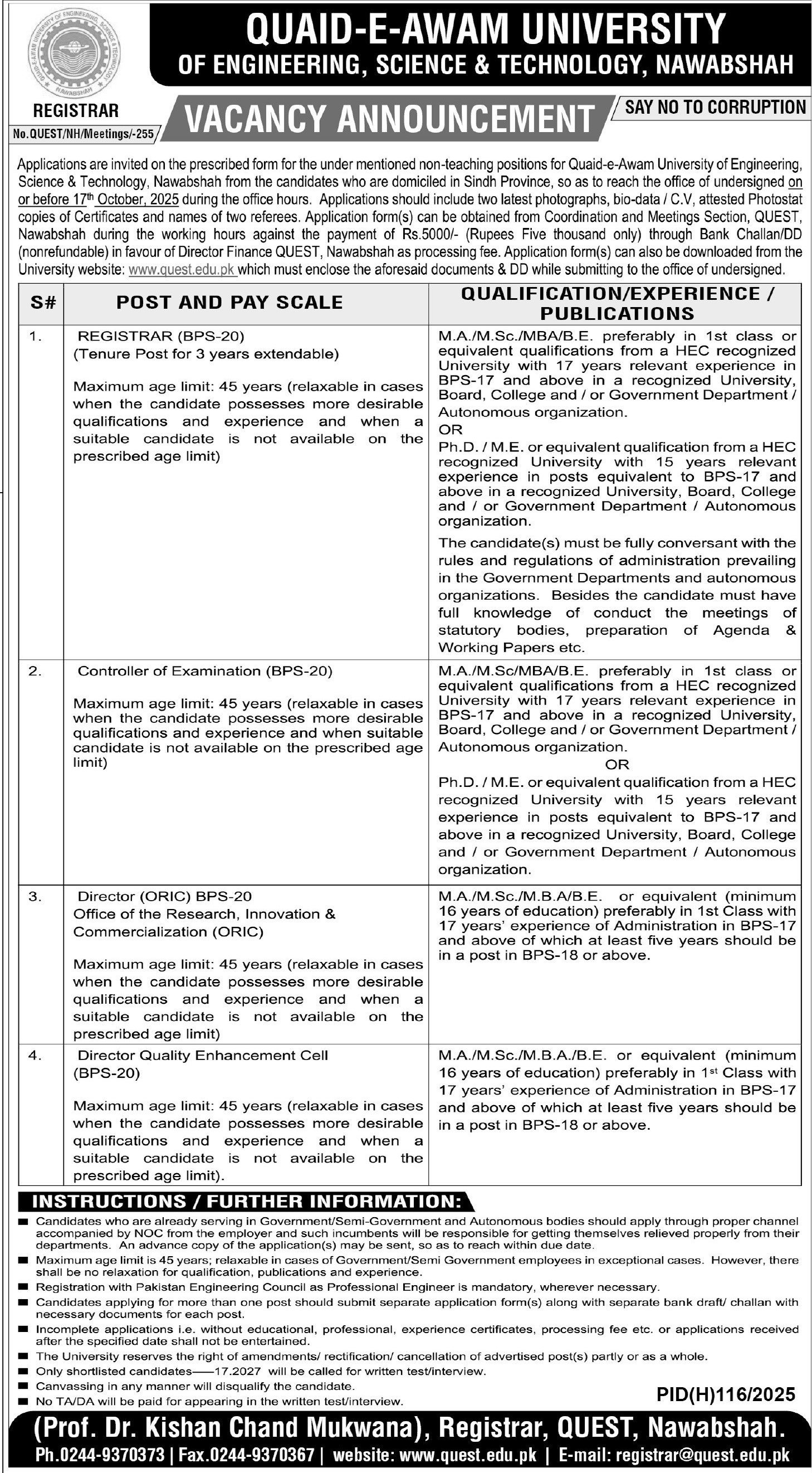 Applications are invited on the prescribed form for the under mentioned non-teaching positions for Quaid-e-Awam University of Engineering, Science & Technology, Nawabshah from the candidates who are domiciled in Sindh Province, so as to reach the office of undersigned on or before 17th October, 2025 during the office hours. Applications should include two latest photographs, bio-data/C.V, attested Photostat copies of Certificates and names of two referees. Application form(s) can be obtained from Coordination and Meetings Section, QUEST, Nawabshah during the working hours against the payment of Rs.5000/- (Rupees Five thousand only) through Bank Challan/DD (nonrefundable) in favour of Director Finance QUEST, Nawabshah as processing fee. Application form(s) can also be downloaded from the University website: which must enclose the aforesaid documents & DD while submitting to the office of undersigned.