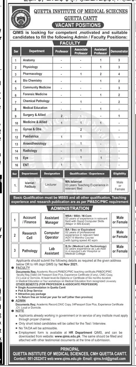 Quetta Institute of Medical Sciences QIMS Jobs 2021 announce the Contract career opportunities for the post of See Below Ad in Balochistan,Quetta for the fresh and experienced candidates on Contract basis who have Check Advertisement degree. Posted date of this post is 15/10/2021 and the last date is 21/11/2021. if you are eligible for this job apply before due date.