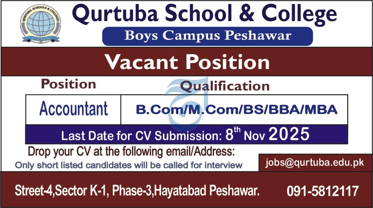 Qurtuba School & College Peshawar Job 2025 announce the Contract career opportunities for the post of See Below Ad in Khyber Pakhtunkhwa, Peshawar for the fresh and experienced candidates on Contract basis who have Check Advertisement degree. Posted date of this post is 30/10/2025 and the last date is 08/11/2025. if you are eligible for this job apply before due date.