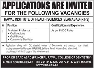 • Application along with CV, attested copies of Documents and passport size latest photograph send to Manager (HR) RIHS, Lehtarar Road, Khanna Dak, Islamabad, should reach within 15 days of this advertisement.