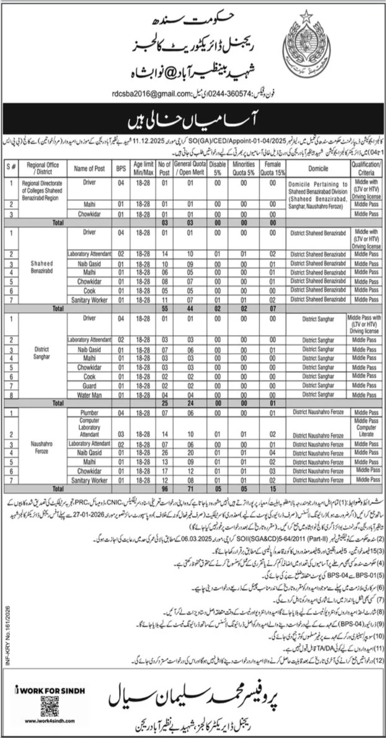 In compliance with the approval of the Government of Sindh, Services, General Administration & Coordination Department (GA&CD) vide letter No. SSO (GA&CD)/Appoint/04-1/2025 dated 11.12.2025, applications are invited from suitable candidates (male/female) domiciled in Shaheed Benazirabad Region for recruitment against the following vacant posts (BPS-01 to BPS-04) in various colleges of Shaheed Benazirabad Region and Sanghar District.