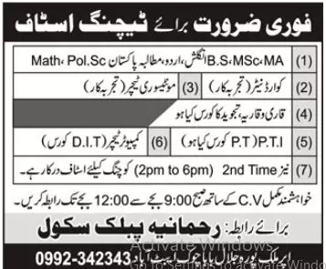 - Rehmania Public School & College is looking for candidates for following posts as per job advertisement published in daily Aaj Newspaper of April 4, 2023 for location Abbottabad, abbottabad Khyber Pakhtunkhwa KPK Pakistan: