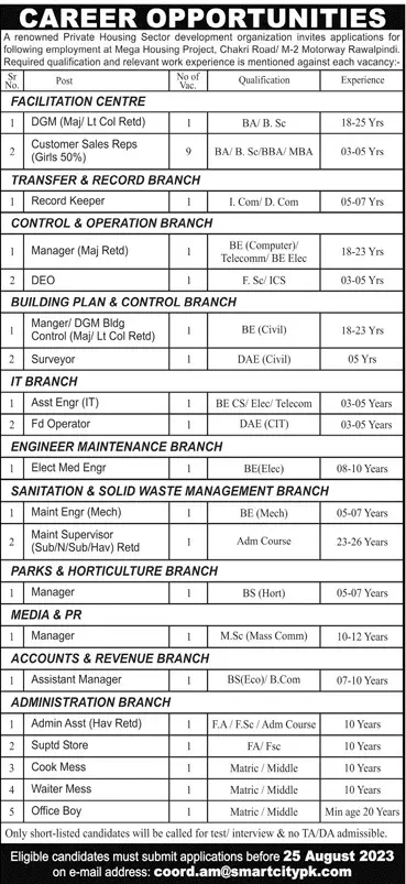 Renowed Private Housing Sctor Development Organization Jobs announce the Contract career opportunities for the post of See Below Ad in Punjab, Rawalpindi for the fresh and experienced candidates on Contract basis who have Check Advertisement degree. Posted date of this post is 20/08/2023 and the last date is 25/08/2023. if you are eligible for this job apply before due date.