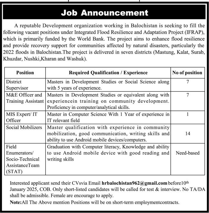 A reputable development organization working in Balochistan is seeking to fill the following vacant positions under the Integrated Flood Resilience and Adaptation Project (IFRAP), which is primarily funded by the World Bank. The project aims to enhance flood resilience and provide recovery support for communities affected by natural disasters, particularly the 2022 floods in Balochistan. The project is delivered in seven districts (Mastung, Kalat, Surab, Khuzdar, Nushki, Kharan, and Washuk).