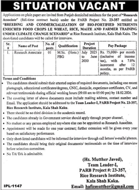 Applications on plain paper are invited from Punjab domiciled residents for the post of "Research Associate (full-time contract basis) under the PARB Project No. 23-357 entitled as "BREEDING AND COMMERCIALIZATION OF BIO-FORTIFIED NUTRIENTS ENRICHED FOOD CROPS I.E WHEAT, RICE, MAIZE AND FARMER TRAINING UNDER CLIMATE CHANGE SCENARIO" at Rice Research Institute, Kala Shah Kaku. The short-listed candidates will be called for interview.