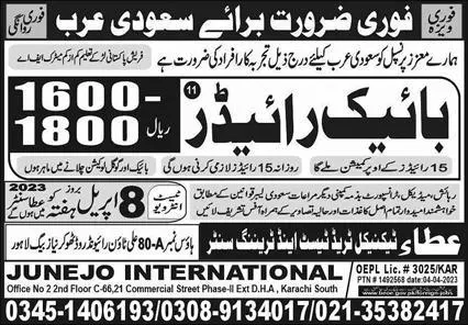 Rider & Bike Rider Jobs 2023 in Saudi Arabia announce the Contract career opportunities for the post of See Below Ad in Saudi Arabia for the fresh and experienced candidates on Contract basis who have Check Advertisement degree. Posted date of this post is 07/04/2023 and the last date is 08/04/2023. if you are eligible for this job apply before due date.