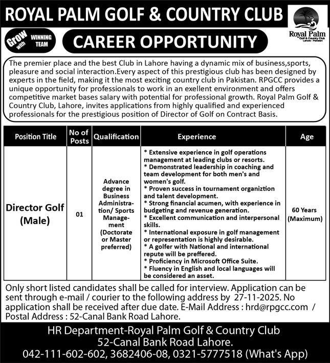 Royal Palm Golf & Country Club Lahore Jobs 2025 announce the Contract career opportunities for the post of See Below Ad in Punjab, Lahore for the fresh and experienced candidates on Contract basis who have Check Advertisement degree. Posted date of this post is 12/11/2025 and the last date is 27/11/2025. if you are eligible for this job apply before due date.