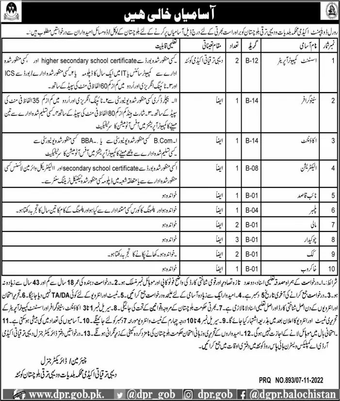 Rural Development Academy RDA Quetta, quetta Balochistan Pakistan invites applications from eligible candidates for the post of cook, accountant, plumber, khakrob, stenographer, chowkidar, assistant computer operator, naib qasid and electrician as per advertisement of November 8, 2022 published in daily Jang Newspaper.