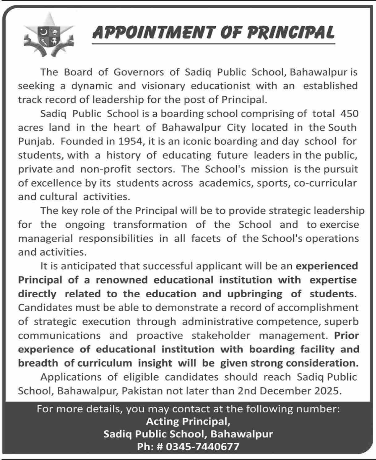 Applications of eligible candidates should reach Sadiq Public School, Bahawalpur, Pakistan not later than 2nd December 2025.