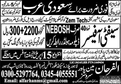 Safety Officer Jobs 2023 in Saudi Arabia announce the Contract career opportunities for the post of See Below Ad in Saudi Arabia for the fresh and experienced candidates on Contract basis who have Check Advertisement degree. Posted date of this post is 14/04/2023 and the last date is 15/04/2023. if you are eligible for this job apply before due date.