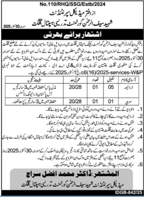 Applications are invited from eligible candidates belonging to District Gilgit for the following vacant posts in Regional Headquarters Shaheed Saif-ur-Rehman Government Teaching Hospital Gilgit. For recruitment, a walk-in interview will be held on Thursday, 30 October 2025 at 11:00 AM at the office of the undersigned. The approval to advertise the following vacant posts was given by the Gilgit-Baltistan Secretariat (S&GAD, Cabinet Department) vide letter No. 16/(1)/2025-services-W&P dated 1 October 2025.
