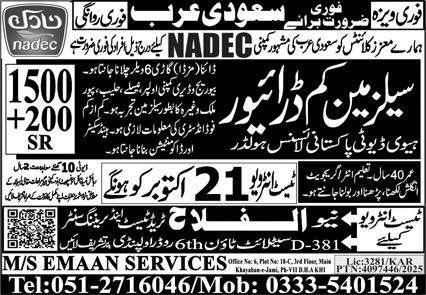 Saleman Kum Driver Jobs in Saudia Arabia 2025 announce the Contract career opportunities for the post of See Below Ad in Saudi Arabia for the fresh and experienced candidates on Contract basis who have Check Advertisement degree. Posted date of this post is 16/10/2025 and the last date is 21/10/2025. if you are eligible for this job apply before due date.