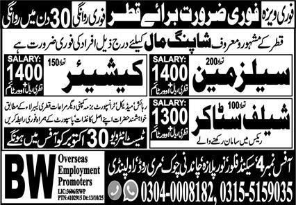 Sales Man And Cashir Jobs in Qatar 2025 announce the Contract career opportunities for the post of See Below Ad in Qatar for the fresh and experienced candidates on Contract basis who have Check Advertisement degree. Posted date of this post is 29/10/2025 and the last date is 30/10/2025. if you are eligible for this job apply before due date.