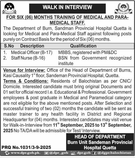Terms & Conditions: Residents of Balochistan as per CNIC/Domicile. Interested candidate must bring original Documents and 01 set for official record i.e. Educational & Professional. Government employees & post graduate in Medical and Paramedical category are not eligible for the above mentioned posts. After Selection and successful training of two (02) months the candidate will be sent as master trainer to any health facility in District and Regional Headquarter for (04) months. Interested candidates may visit venue for Walk-in-Interview from 11th September, 2025 to 13th September, 2025 No TA/DA will be admissible for Test/Interview.