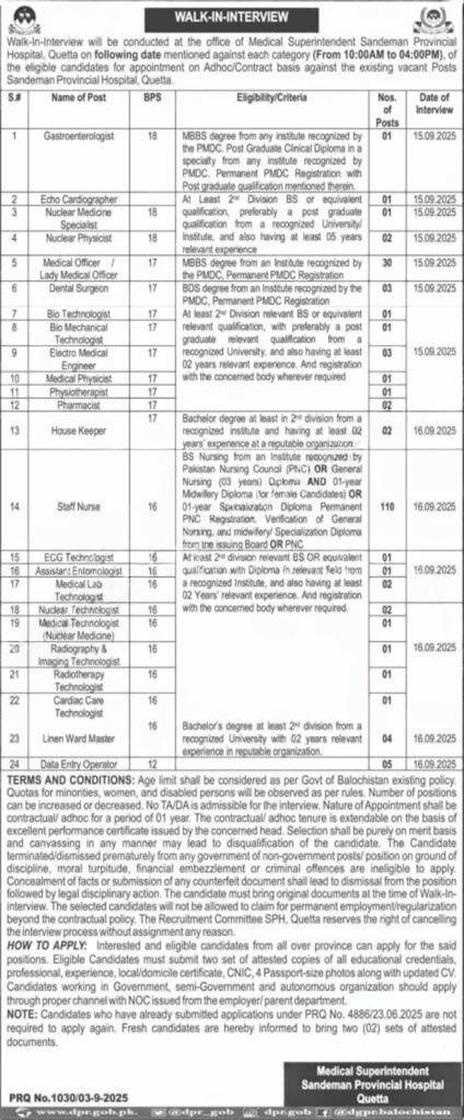 Sandeman Provisional Hospital Quetta Jobs 2025 announce the Contract career opportunities for the post of See Below Ad in Balochistan, Quetta for the fresh and experienced candidates on Contract basis who have Check Advertisement degree. Posted date of this post is 04/09/2025 and the last date is 11/09/2025. if you are eligible for this job apply before due date.
