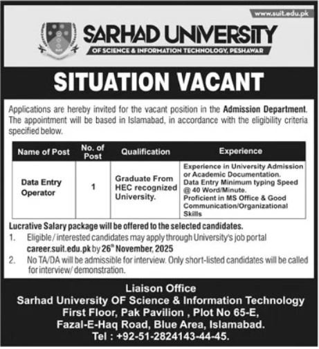 Sarhad University Of Science & Information Technology Job announce the Contract career opportunities for the post of See Below Ad in Federal, Islamabad for the fresh and experienced candidates on Contract basis who have Check Advertisement degree. Posted date of this post is 18/11/2025 and the last date is 26/11/2025. if you are eligible for this job apply before due date.