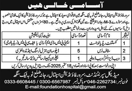 Sarwar Foundation Hospital Rajana, Toba Tek Singh District, is an international standard hospital, a welfare project of Sarwar Foundation, located three kilometers from M-3 Rajana Interchange. Applications are required from eligible candidates for the following vacancies in this 80-bed hospital.