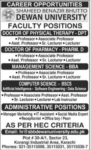 SBB Dewan University Jobs 2026 announce the Contract career opportunities for the post of See Below Ad in Sindh, Karachi for the fresh and experienced candidates on Contract basis who have Check Advertisement degree. Posted date of this post is 21/12/2025 and the last date is 05/01/2026. if you are eligible for this job apply before due date.