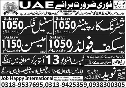 Scaffolder & Mason Jobs 2023 In UAE announce the Contract career opportunities for the post of See Below Ad in United Arab Emirates for the fresh and experienced candidates on Contract basis who have Check Advertisement degree. Posted date of this post is 12/10/2023 and the last date is 13/10/2023. if you are eligible for this job apply before due date.