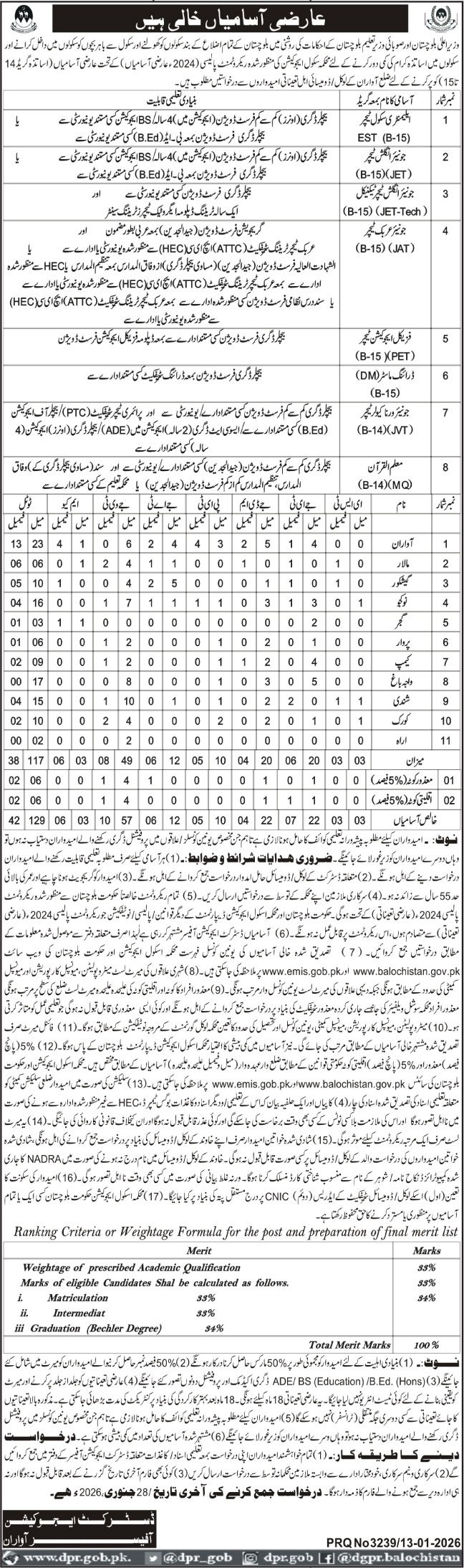 The School Education Department, Balochistan, is seeking applications from eligible candidates for the following temporary vacancies to address the shortage of teachers in schools and enroll out-of-school children: