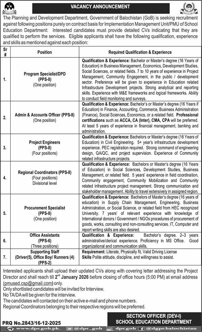The Planning and Development Department, Government of Balochistan (GoB) is seeking recruitment against following positions purely on contract basis for Implementation Management Unit/PMU of School Education Department: Interested candidates must provide detailed CVs indicating that they are qualified to perform the services. Eligible applicants shall have the following qualification, experience and skills as mentioned against each position: