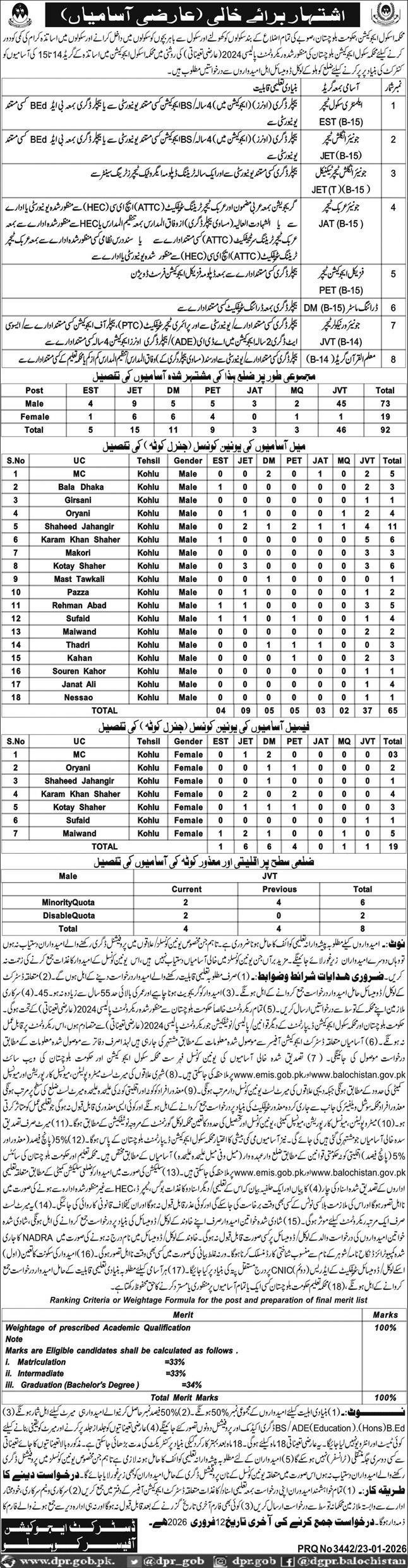 School Education Department Kohlu Jobs 2026 announce the Contract career opportunities for the post of See Below Ad in Balochistan, Kohlu for the fresh and experienced candidates on Contract basis who have Check Advertisement degree. Posted date of this post is 25/01/2026 and the last date is 09/02/2026. if you are eligible for this job apply before due date.