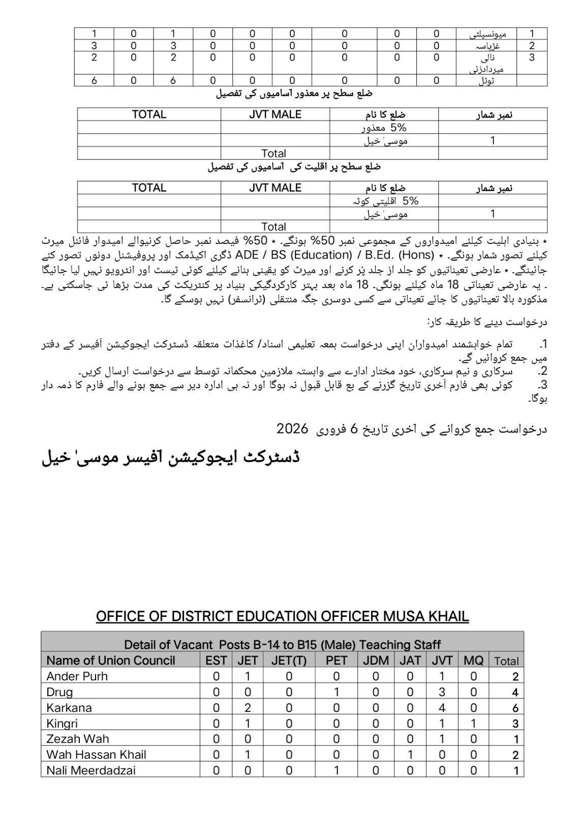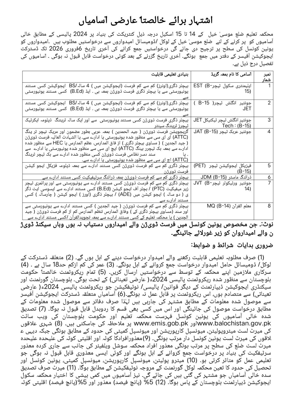School Education Department Musakhel Balohistan Jobs 2026 announce the Contract career opportunities for the post of See Below Ad in Balochistan, Musakhel for the fresh and experienced candidates on Contract basis who have Check Advertisement degree. Posted date of this post is 27/01/2026 and the last date is 06/02/2026. if you are eligible for this job apply before due date.