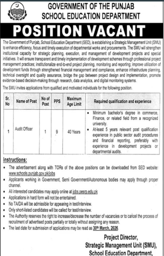 School Education Department Punjab Jobs 2026 announce the Contract career opportunities for the post of See Below Ad in Punjab, Lahore for the fresh and experienced candidates on Contract basis who have Check Advertisement degree. Posted date of this post is 15/03/2026 and the last date is 30/03/2026. if you are eligible for this job apply before due date.