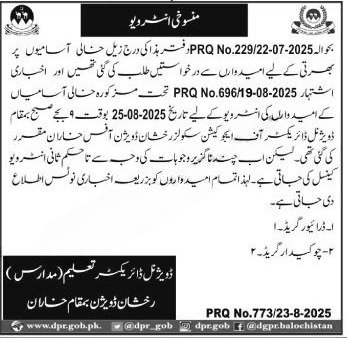 School Education Department Rakshan Division Driver Chowkida announce the Contract career opportunities for the post of See Below Ad in Balochistan, Quetta for the fresh and experienced candidates on Contract basis who have Check Advertisement degree. Posted date of this post is 21/08/2025 and the last date is 25/08/2025. if you are eligible for this job apply before due date.