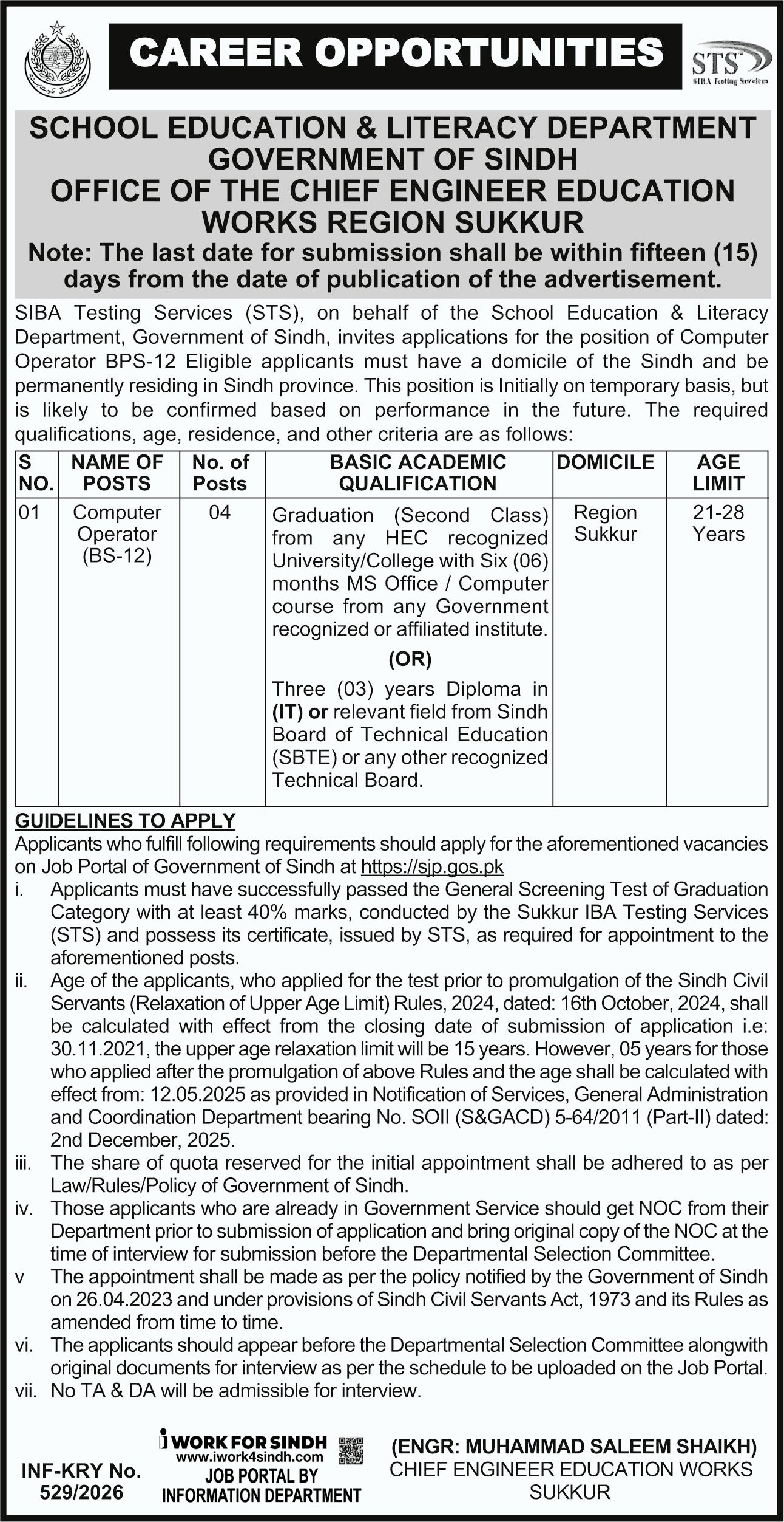 School Education & Literacy Department Sukkur Job 2026 announce the Contract career opportunities for the post of See Below Ad in Sindh, Sukkur for the fresh and experienced candidates on Contract basis who have Check Advertisement degree. Posted date of this post is 13/02/2026 and the last date is 28/02/2026. if you are eligible for this job apply before due date.