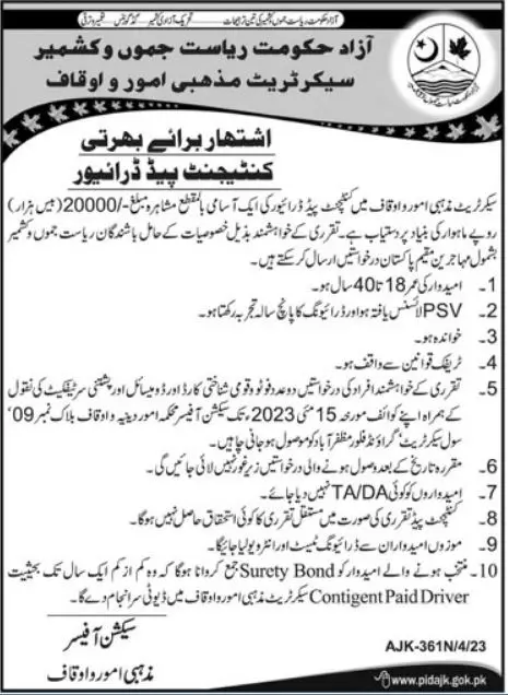- Vacant posts including driver are announced in Auqaf Religious Affairs and Zakat & Ushr Department Muzaffarabad, muzaffarabad AJK Pakistan as per 7 April 2023 advertisement in daily Ausaf Newspaper. Preferred Education is Primary etc.