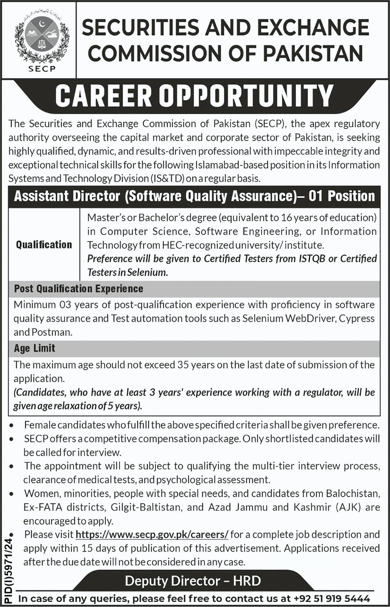 Securities And Exchange Commission Islamabad Jobs 2025 announce the Contract career opportunities for the post of See Below Ad in Federal, Islamabad for the fresh and experienced candidates on Contract basis who have Check Advertisement degree. Posted date of this post is 02/03/2025 and the last date is 17/03/2025. if you are eligible for this job apply before due date.