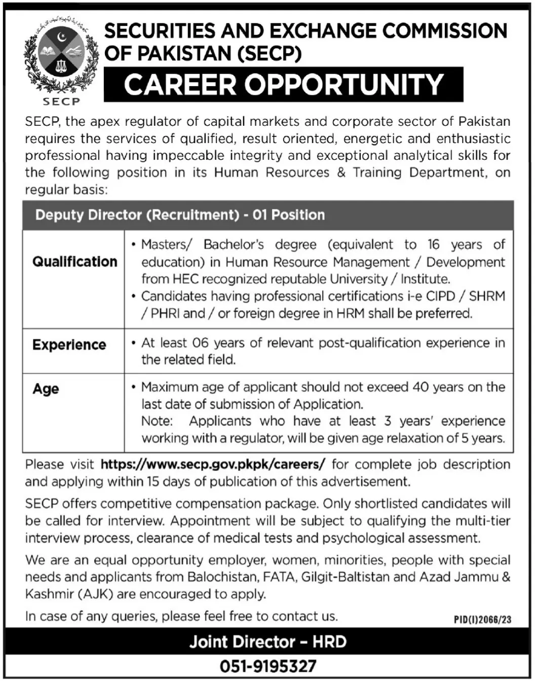 Please visit https://www.secp.gov.pkpk/careers/ for complete job description and applying within 15 days of publication of this advertisement.