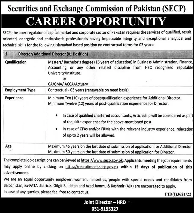- Security & Exchange Commission of Pakistan SECP Islamabad, islamabad Islamabad Pakistan invites applications from eligible candidates for the post of assistant director, deputy director and additional join director as per advertisement of December 11, 2022 published in daily Other Newspaper.