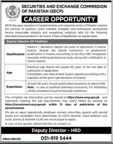 Securities & Exchange Commission Of Pakistan SECP Jobs 2023 announce the Contract career opportunities for the post of See Below Ad in Federal, Islamabad for the fresh and experienced candidates on Contract basis who have Check Advertisement degree. Posted date of this post is 18/06/2023 and the last date is 03/07/2023. if you are eligible for this job apply before due date.