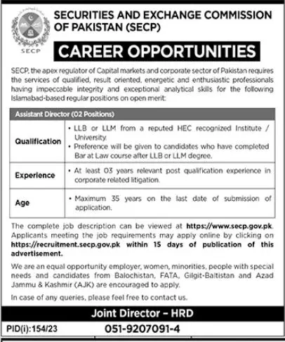 - The complete job description can be viewed at https://www.secp.gov.pk.