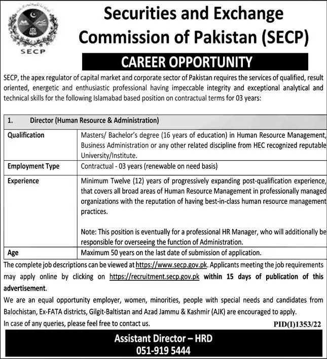 Security & Exchange Commission Of Pakistan Jobs 2022 announce the Contract career opportunities for the post of See Below Ad in Federal,Islamabad for the fresh and experienced candidates on Contract basis who have Check Advertisement degree. Posted date of this post is 04/09/2022 and the last date is 19/09/2022. if you are eligible for this job apply before due date.
