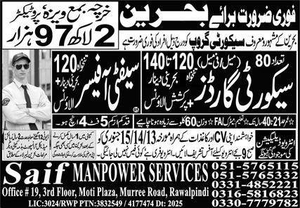 Security Guard And Safety Officer Jobs in Bahrin 2026 announce the Contract career opportunities for the post of See Below Ad in Bahrain for the fresh and experienced candidates on Contract basis who have Check Advertisement degree. Posted date of this post is 13/01/2026 and the last date is 15/01/2026. if you are eligible for this job apply before due date.