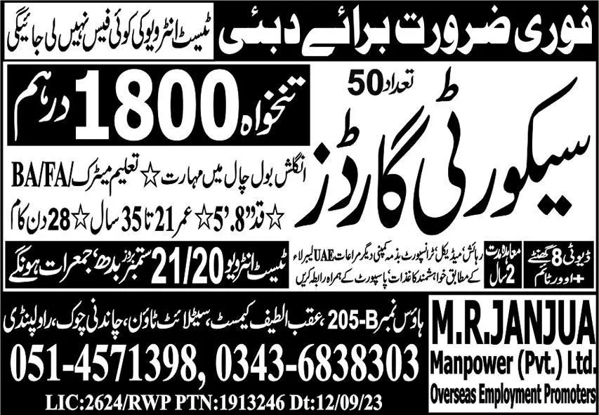 Security Guard Jobs 2023 In Dubai announce the Contract career opportunities for the post of See Below Ad in Dubai for the fresh and experienced candidates on Contract basis who have Check Advertisement degree. Posted date of this post is 17/09/2023 and the last date is 21/09/2023. if you are eligible for this job apply before due date.