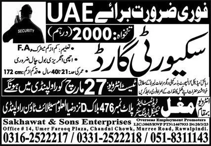 Security Guard Jobs 2023 in UAE announce the Contract career opportunities for the post of See Below Ad in United Arab Emirates for the fresh and experienced candidates on Contract basis who have Check Advertisement degree. Posted date of this post is 26/03/2023 and the last date is 27/03/2023. if you are eligible for this job apply before due date.